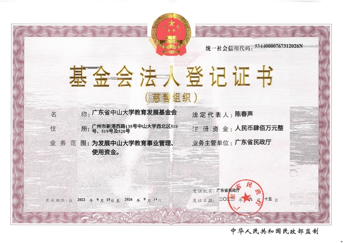 广东省中山大学教育发展基金会于2004年9月在广东省民政厅正式注册。