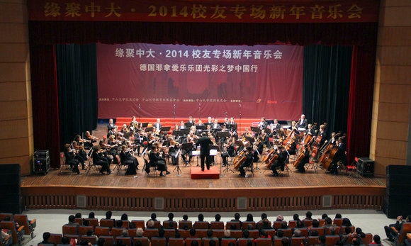 12月14日下午,“缘聚中大·2014校友专场新年音乐会”—— 德国耶拿爱乐乐团光彩之梦中国行在南校区梁球琚堂举办。此次音乐会由中山大学校友总会、中山大学教育发展基金会主办,中山大学德国校友会承办。校党委副书记、校友总会常务副会长、教育发展基金会副理事长李萍出席了音乐会并致辞。校长助理陈绍彬、德国耶拿市市长Dr. Schröter、副市长Jauch以及中山大学德国校友会吴民智会长出席了音乐会。近1500位来自各地的中大人齐聚一堂,共叙情谊,欢庆新年,聆听音乐盛宴。