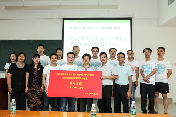 近日,我校化学与化学工程学院2000级校友齐聚一堂,在学院举行了毕业十周年聚会。聚会上,校友们自发倡议的“中山大学化学与化学工程学院2000级同学联谊会”(以下简称“联谊会”)正式成立,并以此名义向珠海校区校友基金捐款支持校区公共设施建设。联谊会承载了2000级校友们对“增进友谊、相互砥砺、同道相益、服务大众,为母校中山大学及化学与化学工程学院的发展和社会进步贡献力量”的美好愿景。