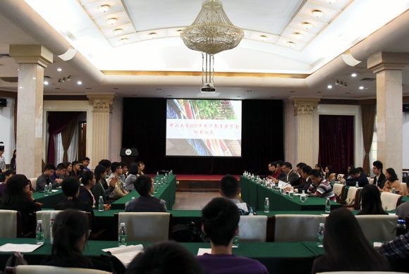 陈振川介绍了光华教育基金会和2014年新设立的唐奖(Tang Prize)的有关情况,激励同学们通过自己的勤奋努力成就事业,并将助人为乐的精神传递下去。