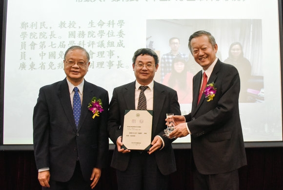 陈春声书记和李焯芬院士分别向获奖者颁发证书和奖杯。今年的五个获奖团队及个人分别是:鼻咽癌精准治疗研究创新团队(带头人:肿瘤防治中心马骏教授),超分子结构与材料化学团队(带头人:化学学院苏成勇教授),腹部多器官移植团队(带头人:附属第一医院何晓顺教授),肿瘤组织微环境研究团队(带头人:生命科学学院郑利民教授),刘奕志教授。