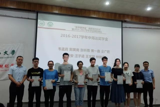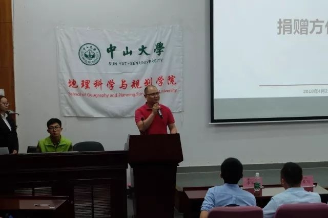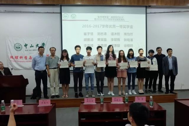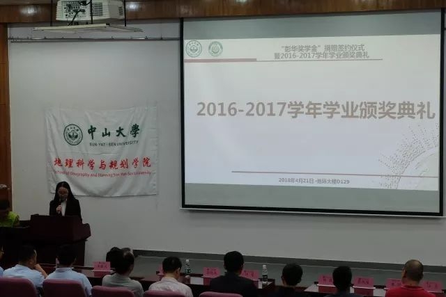 2018年4月21日下午16:00~18:00,地理科学与规划学院“彭华奖学金”捐赠签约仪式暨2016-2017学年学业颁奖典礼在地环大楼D129顺利举行。中山大学教育发展基金会黄源穗副秘书长、中山大学地理科学与规划学院党委谷晓丰书记、许粤副书记、院长助理辛秦川老师、国土资源与环境系主任高全洲老师、城市与区域规划系主任林耿老师、水资源与环境系林凯荣老师及辅导员孔碧云老师、陈素玲老师、姚宏亮老师等师生约180人出席。出席本次活动的嘉宾还有20余位热心校友和捐赠方代表,分别是:彭华老师夫人丰秀荣老师、(97届校友)广东省旅游局陈卫东副处长、广州途里人旅游投资公司陈欢总经理、广东丹霞印象客栈民宿管理有限公司符小蜜董事长、韶关市工商行政管理局郭世明科长、(95届校友)中山大学丁健老师、(06届校友)暨南大学王华教授、(08届校友)中山大学涂新军老师、(08届校友)中山大学翁时秀老师、(13届校友)中山大学雷世菁老师、(17届校友)中山大学闫罗彬老师、(02届校友)广州市增城区城乡规划与测绘地理信息研究院黄悦部长、广州中海达卫星导航技术股份有限公司大客户部崔寒经理和余博斌市场总监、中山大学房地产EMBA同学会常务副会长汪力老师等。