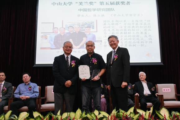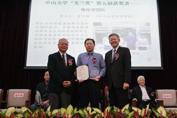 陈春声书记和李焯芬院士向获奖者颁发证书和奖杯。今年的五个获奖团队分别是:中国哲学研究团队(带头人:哲学系陈立胜教授),电化学团队(带头人:化学学院童叶翔教授),炎症性肠病创新研究团队(带头人:附属第一医院陈旻湖教授),乳腺癌研究创新团队(带头人:孙逸仙纪念医院宋尔卫教授)和微创脊柱脊髓修复团队(带头人:附属第三医院戎利民教授)。