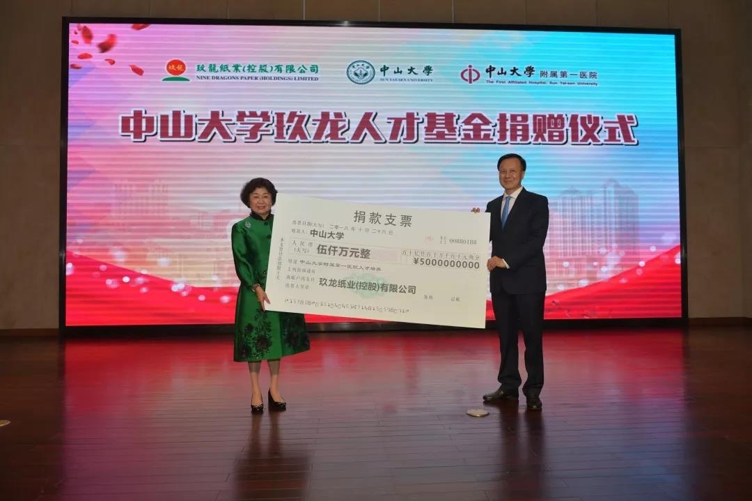 10月26日下午,香港玖龙纸业有限公司(简称玖龙纸业)向中山大学附属第一医院(简称中山一院)捐赠5000万元设立中山大学玖龙人才基金,支持中山大学附属第一医院人才发展。玖龙纸业董事长张茵女士、中山大学副校长、中山大学附属第一医院院长肖海鹏,中山大学附属第一医院党委骆腾书记、中山大学教育发展基金会黄源穗副秘书长等出席捐赠仪式,中山大学附属第一医院文卫平副院长主持仪式。