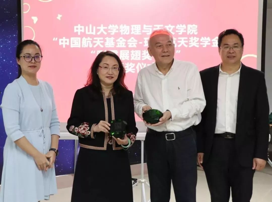 颁奖仪式上,中国航天基金会副秘书长王塞南、广州环亚化妆品科技有限公司总裁吴知情向物理与天文学院赠送捐赠支票板,教育发展基金会副秘书长黄源穗、学院林伟鹏院长回赠鸣谢证书及纪念品。