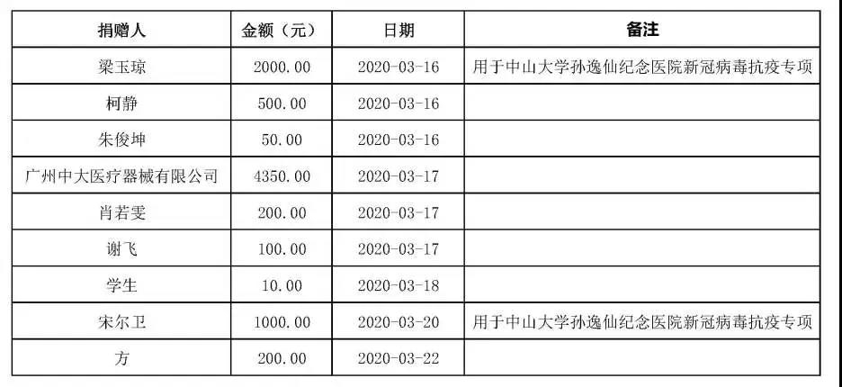 公示|中山大学医疗支援专项基金捐赠情况(3月16日至3月23日)