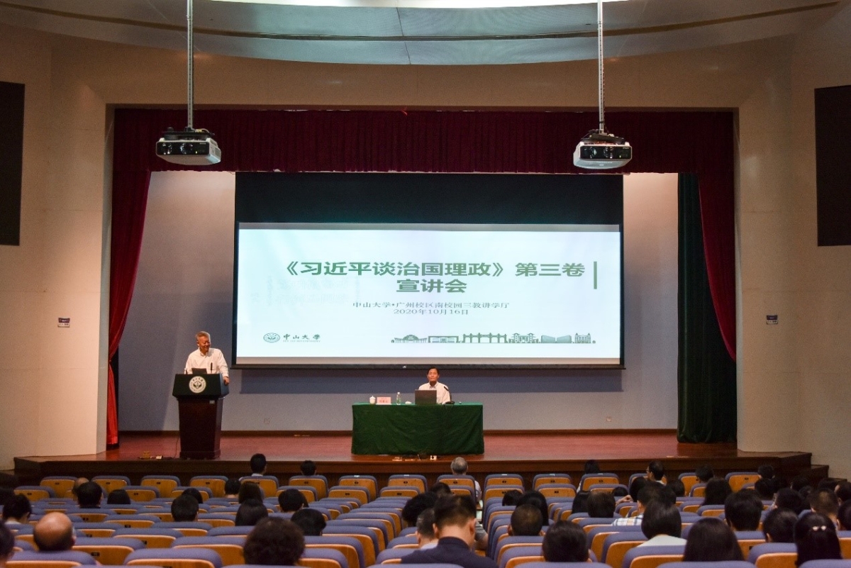 10月16日上午,我校在广州校区南校园三教讲学厅举行《习近平谈治国理政》第三卷宣讲会,邀请省委宣讲团成员、省委宣传部副部长杜新山同志作宣讲。校党委书记陈春声、校长罗俊出席宣讲会。在校的校领导、校长助理、校院两级党委理论学习中心组成员、职能部门负责人,共1000余名教职工在各会场收听收看宣讲会。宣讲会由校党委书记陈春声主持。