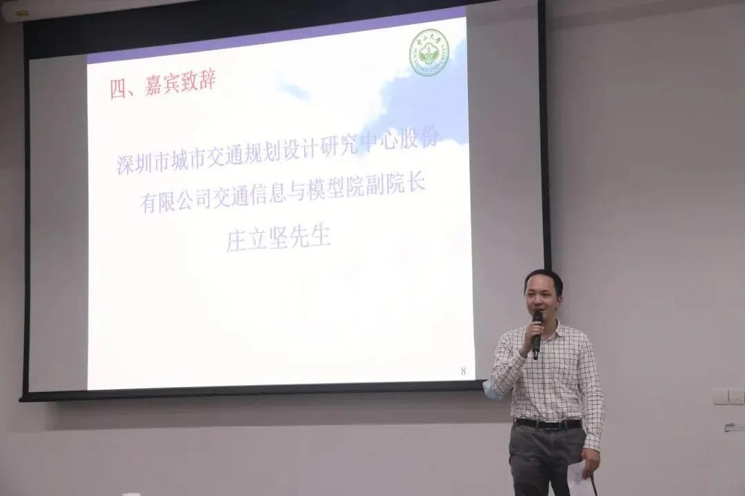 最后由深圳市城市交通规划设计研究中心股份有限公司交通信息与模型院副院长庄立坚先生致辞。他以“来了深圳就是深圳人”这句俗语开头,相信大家能一起见证深圳更好的未来。他结合了他在深圳学习拼搏的人生经验,提出了三个重点:学习,此时努力最重要;实践,累积经验不断提升自我;竞争,要靠自身独特的优势。最后他表示,交通这个专业未来可期,他对交通学子们满怀期待。他还强调了成绩的重要性,希望同学们不忘初心,方得始终。
