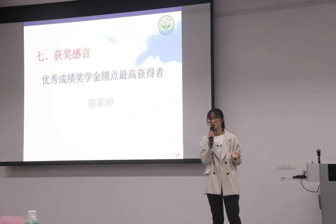 颁奖仪式第三项,是向获奖学生颁发奖励。共五批41名学生依次上台领奖。接着,由陈彩婷同学发表获奖感言。这是她第三次获得交通基金的奖学金,对此,她感触良多。陈彩婷同学首先表达了对交通基金和老师们的感谢,然后分享了她的学习经验与收获。第一点是要坚定自己的信念,取得好成绩的背后是不断的努力与坚持。第二点是态度决定一切,在自己的能力范围内把每一件事做到最好,要对自己有要求、有目标。同时她也讲到,比绩点更重要的是学习能力和沟通、表达能力,要在大学不断锻炼自身能力。最后,她希望大家能坚定自己的目标,并对未来充满期待。