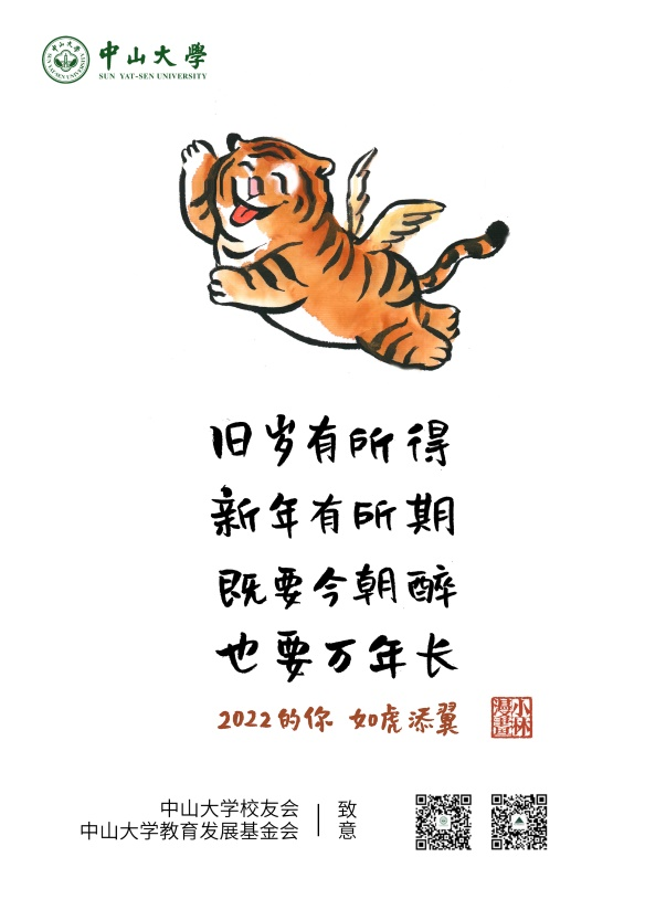 圆滚滚的小老虎露出憨态可掬的笑容,扇动翅膀飞向2022年光明的新征程。正如小林老师在下面为大家所写的祝福一般——“旧岁有所得,新年有所期”,小老虎的翅膀,既是旧岁辛勤所得的积累,也为新的一年点燃了新的期待和希望。我们中大人的2022年将会是如虎添翼的一年!