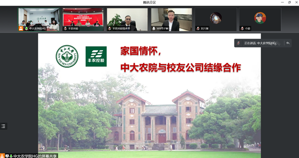 随后,丰农控股丰诚上品CEO高聃介绍了丰农奖学金设立初衷及奖助办法。高总表示,丰农控股公司自2014年成立以来,以“提升农业价值”为使命,提供定制化种植方案、农场托管、 产销对接、农民教育、农业Ai智能科技、农业产业投资等农业服务。公司核心管理团队中有4位中大信息、化工、管理学院毕业的校友,如今跨界从事现代农业企业经营,深耕产业振兴和人才振兴。得知母校复办农学院,丰农公司特在母校的农学院设立“丰农奖学金”,在3年内捐赠人民币51万元,设立优秀学生奖学金和突出贡献奖学金,助力新农科人才的培养。