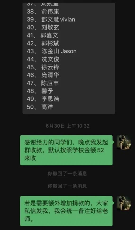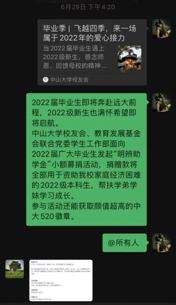 6月29日,4班班长在校友理事群中留意到“明辨助学金”的活动信息,随后立刻在班级群里发起倡议,提议大家以班级的名义进行集体捐赠。以班级名义支持公益活动,一直是4班的传统。消息一经发出,同学们积极响应号召,踊跃参与募捐,将小小心意汇聚成大大爱意。短短1日内,几乎全班同学都表示愿意参与班级捐赠,而个别在外地的同学也采用了个人捐赠的形式为母校学子尽一份力。他们无一例外,都希望尽一份心意给学弟学妹们提供更好的学习环境,激励他们努力学习,全方位成长成才。感念师恩、回馈母校的精神,在两代学子间接力。