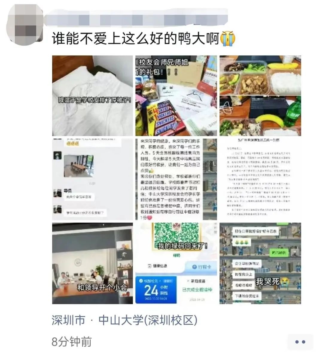这份爱心包以最快速度,于当天下午由深圳校友专车亲自送达隔离场所。