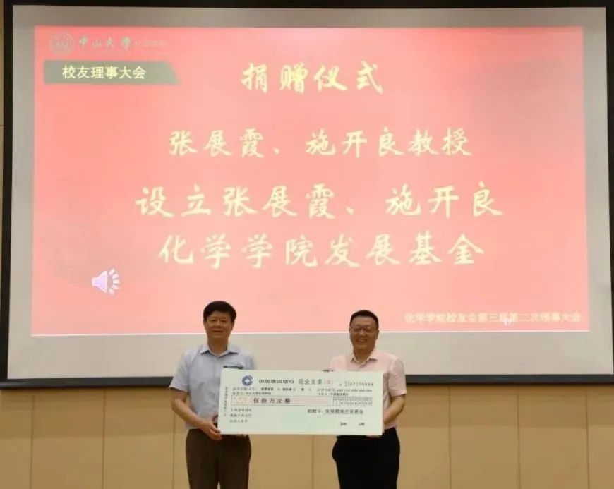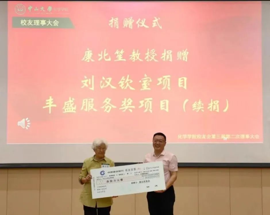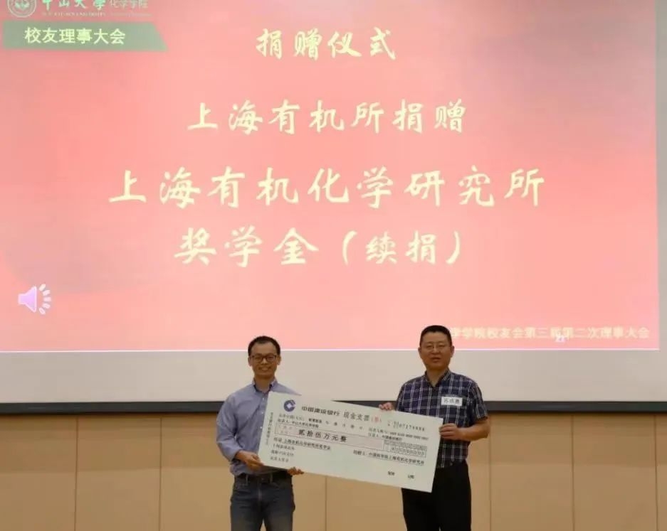 大会的第二部分是捐赠仪式和颁奖典礼。为支持化学学院的建设发展,张展霞、施开良教授向学院捐赠50万元设立“张展霞、施开良化学学院发展基金”;康北笙教授捐赠30万元建设“刘汉钦讲学厅”,同时续捐10万元继续设立化学学院“丰盛服务奖”奖教金项目;林永成教授捐赠30万元注入化学学院“龙康侯奖学金”项目;祁存谦教授续捐9万元设立“祁存谦-叶颖敏奖学金”项目;上海有机化学研究所续捐25万元继续设立“上海有机化学研究所奖学金”项目。众多校友和社会各届人士的慷慨捐赠为中山大学化学学院未来的发展提供了有力的支撑。