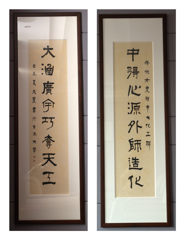 刘学长十分热爱传统文化,在古典文学、古诗词和书法上都有很深造诣。“芙兰学术中心”碑文就是由李焯芬院士撰文,刘学长亲自书写。从书法中,刘学长领悟了许多做人的道理:“写字就像做人,笔法之间的交错与配合就像人与人之间的交往,无论是朋友或是夫妻,都要学会互相迁就对方;从字帖中找出不足,做人也是要不断挑剔自己的缺点,缺点少了,人就进步了。”学长一席话,让我们获益良多。