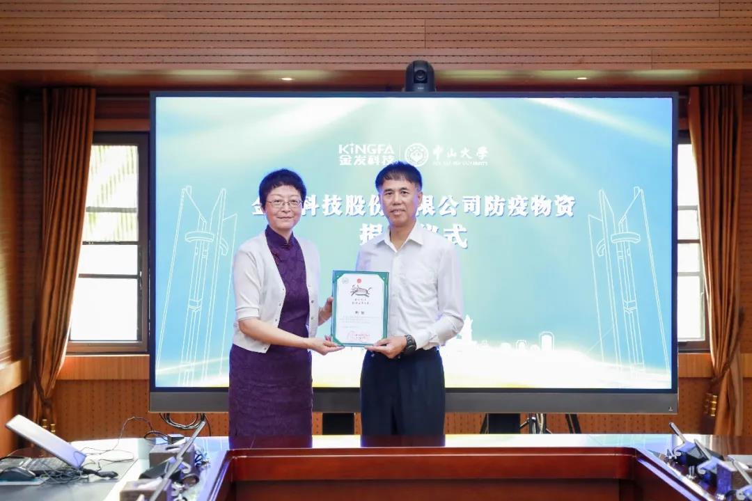 随后,金发科技代表丁敏总经理向中山大学代表黄瑞敏主任捐赠物资,国亚萍副书记向李南京书记颁发捐赠鸣谢函。