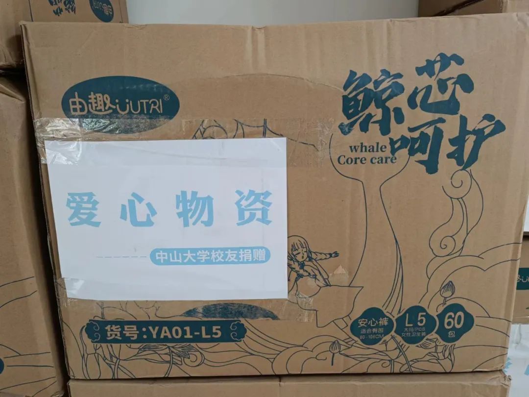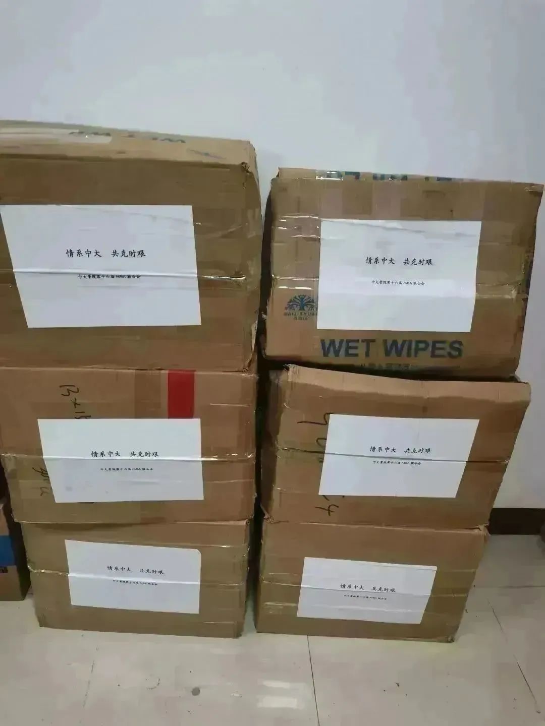 王梓贤、陈雨童校友伉俪捐赠500ml酒精1800瓶(在途)、女性卫生裤、卫生巾20箱2200包。