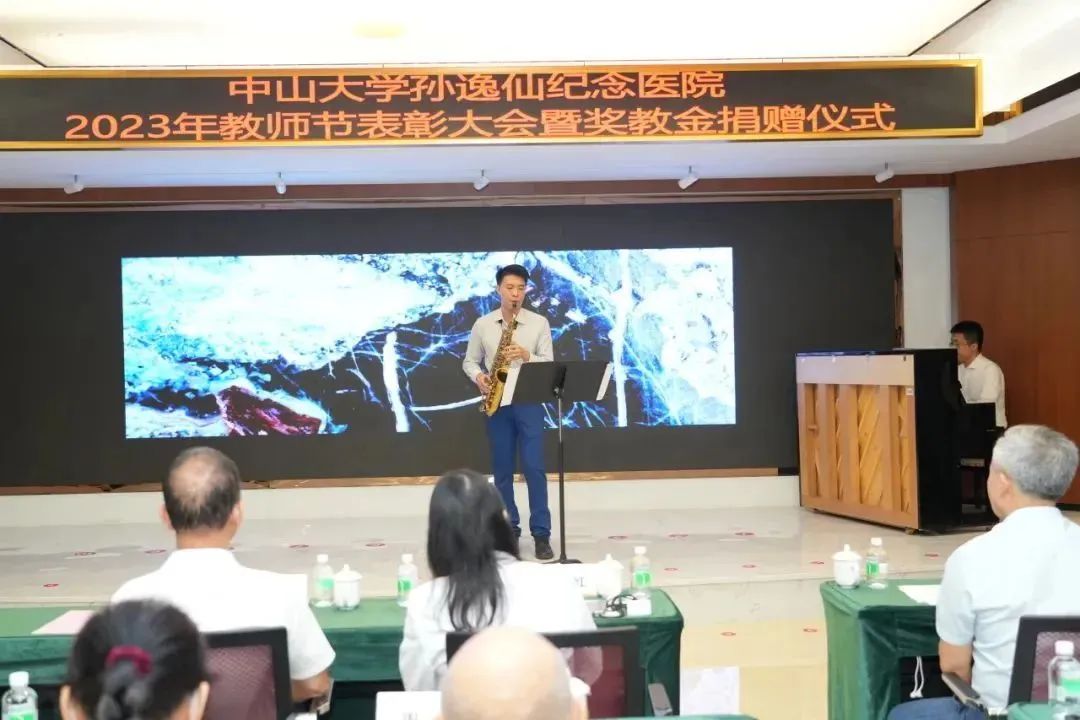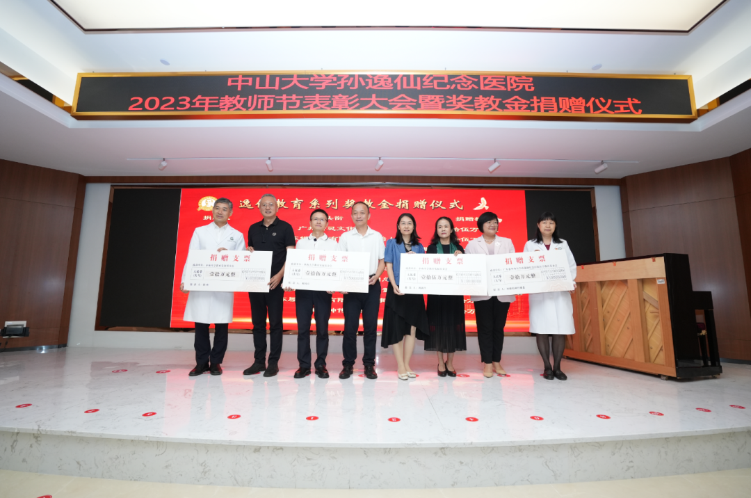 为进一步落实立德树人根本任务,回顾中山大学孙逸仙纪念医院一年以来的教学工作取得的成果,表彰在教学战线涌现出来的先进模范,9月6日下午,医院在岭南楼海珠厅隆重举行庆祝2023年教师节表彰大会暨奖教金捐赠仪式。中山大学继续教育学院院长兼产业集团党委书记、董事长杨元红、中山大学校友会副秘书长黄婷婷,医院院长宋尔卫院士、医院党委古小红书记、副院长刘超、林天歆、姚和瑞、陈样新、唐亚梅、校级及院级教学督导出席大会,医院全体中层干部、优秀教师代表、学生代表参加大会。名医名师周寿恺的儿子儿媳周任、陈渝仙伉俪、李廷安教授的孙女李青女士,广东省医学会理事与医学历史学分会主任委员、广州中医药大学中医医史文献学系李永宸教授,逸仙教育系列奖教金项目捐赠人、中山大学岭南学院EDP同学会和继续教育学院校友会企业家联合会校友刘新玲女士、刘国宾先生、陈山先生、余俊贤先生、付常山先生、汪博士先生的代表刘冬先生、吴启超先生家人代表洪晓明女士,捐赠人柯麟精神传播者受邀出席活动。大会由陈样新副院长主持。